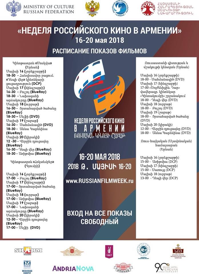 Հայաստանի Հանրապետությունում` 2018 թվականի մայիսի 16-20-ն անցկացվում է «Ռուսական ֆիլմերի շաբաթ Հայաստանում» ծրագիրը: Միջոցառման ընթացքում Երևան և Գյումրի քաղաքներում կցուցադրվեն ժամանակակից Ռուսաստանի կյանքը ներկայացնող, ինչպես նաև պատմական թեմաներով ռուսական տարբեր ժանրերի գեղարվեստական և վավերագրական նոր կինոնկարներ: