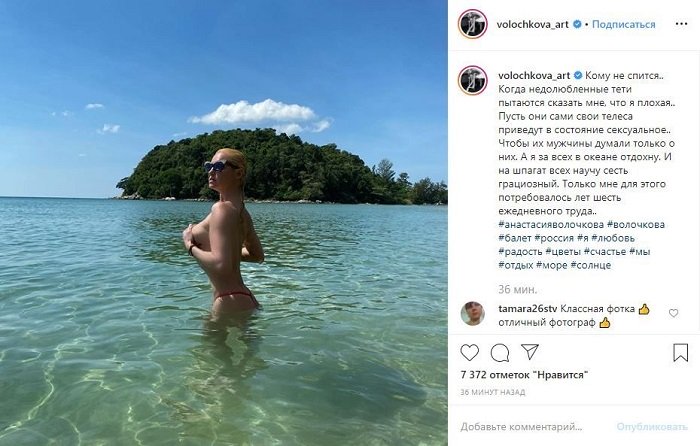 «Երբ չսիրված կանայք ինձ փորձում են ասել, որ ես վատն եմ, թող իրենք իրենց մարմինը սեքսուալ վիճակի հասցնեն։ Որպեսզի նրանց տղամարդիկ միայն նրանց մասին մտածեն։ Իսկ ես բոլորի փոխարեն կհանգստանամ օվկիանոսում։ Եվ բոլորին կսովորեցնեմ նրբագեղ շպագատ նստել։ Միայն թե դրա համար ինձանից 6 տարվա ամենաօրյա աշխատանք է պահանջվել»,- գրել է Վոլոչկովան։
