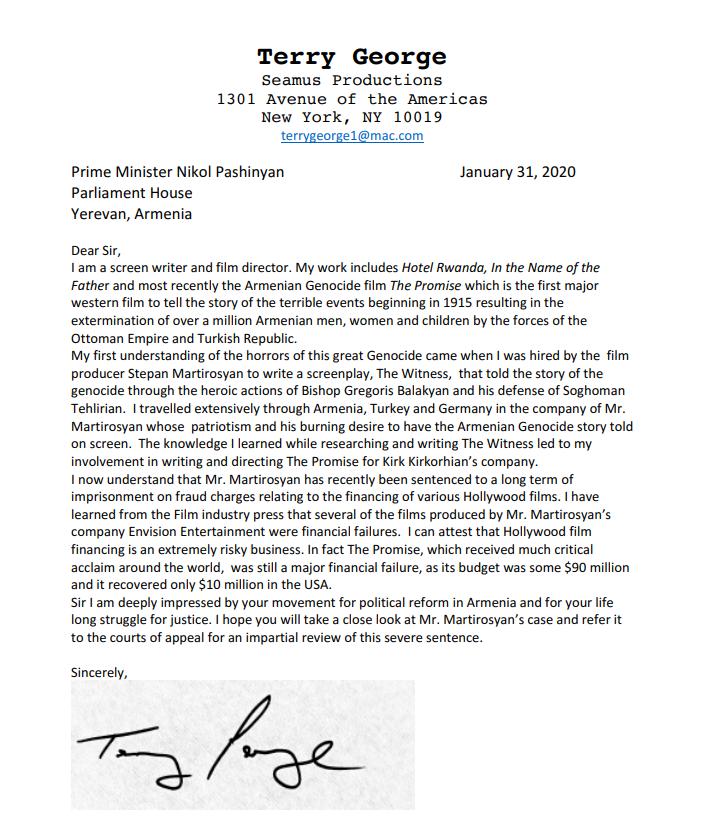 «Խոստումը» ֆիլմի ռեժիսոր Թերի Ջորջը կինոպրոդյուսեր Ստեփան Մարտիրոսյանի գործի վերաբերյալ դիմել է Նիկոլ Փաշինյանին
