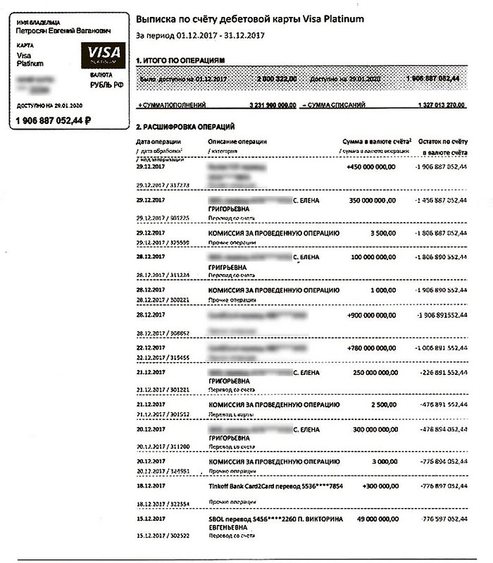 Կատակերգու Եվգենի Պետրոսյանը նախկին կնոջ՝ Ելենա Ստեպանենկոյի հաշվին 2017թ.-ի դեկտեմբերին մեկ միլիարդ ռուբլի է փոխանցել։ Այս մասին ասվում է Պետրոսյանի բանկային հաշիվներից մեկի քաղվածքում, որը հայտնվել է «Կոմսոմոլսկայա պրավդա»-ի լրագրողների տրամադրության տակ։