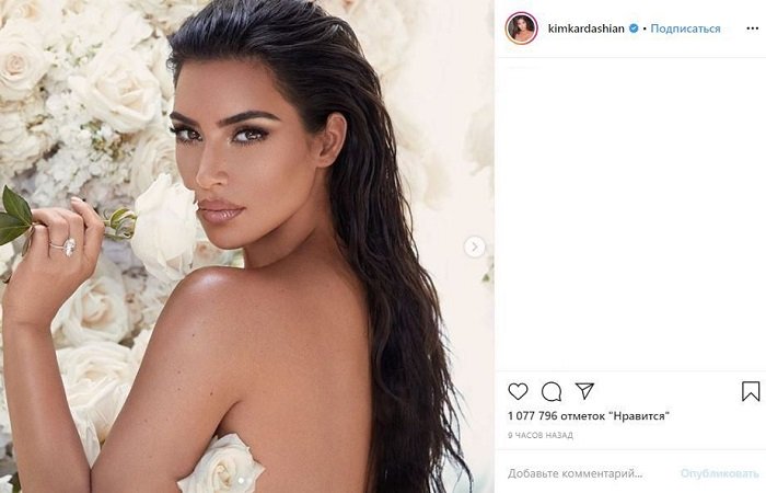 Նոր լուսանկարում Քիմը պատկերված է բազմաթիվ սպիտակ վարդերի շրջապատում` ցուցադրելով մերկ մեջքն ու ուսերը: Այս ֆոտոշարքով Քիմը նախորդ տարի հայտնել էր հարսենկան հավաքածուի մասին։ Հատկապես աչքի է զարնում հսկայական ադամանդը, որը զարդարում է Քիմ Քարդաշյանի մատանին: