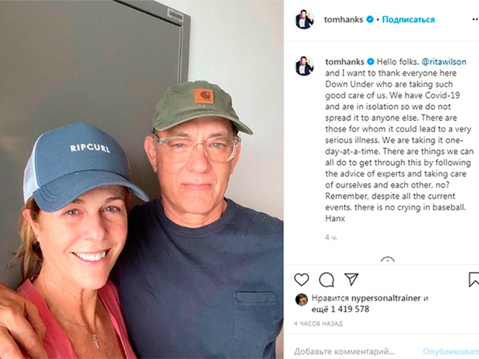 «Ողջույն, ընկերներ։ Ռիտա Ուիլսոնն ու ես ցանկանում ենք շնորհակալություն հայտնել բոլորին, ովքեր այդքան լավ հոգ են տանում մեր մասին։ Մեզ մոտ COVID-19 է հայտնաբերվել, եւ մենք մեկուսացման մեջ ենք, որպեսզի հիվանդությունն ավելի չտարածվի։ Կան մարդիկ, որոնց դեպքում դա կարող է շատ լուրջ հիվանդության հանգեցնել։ Հիշեք, ոչ անկախ ներկայիս իրադարձություններից՝ բեյսբոլում լաց չեն լինում»,- գրել է Թոմը՝ հավելելով, որ վիրուսի դեմ պայքարի համար մարդիկ պետք է հետեւեն բժիշկների եւ փորձագետների խորհուրդներին։