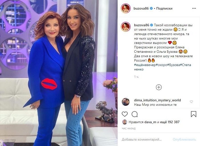 «Դուք հաստատապես ինձանից նման համագործակցություն չէիք սպասում։ Ես եւ հայրենական հումwրի լեգենդը, նա, ում կատակներով իմ շատ հասակակիցներ մեծացել են։ Հիասքանչ ու շքեղ Ելենա Ստեպանենկո եւ Օլգա Բուզովա։ Երկու կրակ նոր շոում»,- հրապարակումը մակագրել է աստղը։