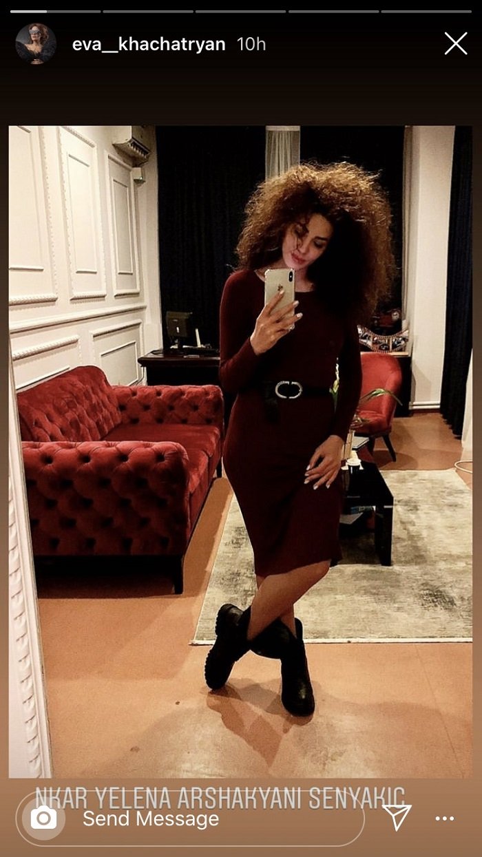 Instagram-յան էջի Stories բաժնում (այստեղ ցանկացած տեղեկավություն հասանելի է միայն 24 ժամ, ինչից հետո անհետանում է) հրապարակված լուսանկարում դերասանուհին միջին երկարության, բալագույն զգեստ է կրում։ Էվան արձակել է մազերը։ Էվան նախապատվություն է տվել սեւ երկարաճիտ կոշիկներին։ Որպես աքսեսուար՝ նա սեւ գոտի է ընտրել։