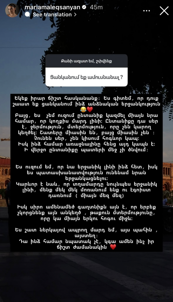 «Ես ուզում եմ, որ նա երջանիկ լինի ինձ հետ, իսկ ես պատասխանատվություն ունենամ նրան երջանկացնելու». Մարիամ Ալեքսանյանը պատասխանել է ամուսնության մասին հարցին
