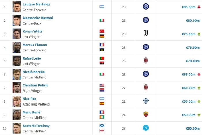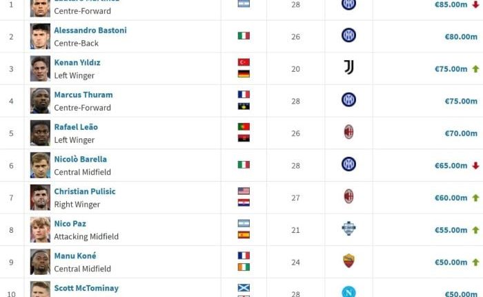 Իտալիայի փոխչեմպիոն Միլանի «Ինտերի» եւ աշխարհի չեմպիոն Արգենտինայի հավաքականի հարձակվող Լաուտարո Մարտինեսը Ա Սերիայի ամենաթանկ տրանսֆերային արժեք ունեցող ֆուտբոլիստն է՝ 85 միլիոն եվրո։ Transfermarkt-ը վերանայել է Ա Սերիայի ֆուտբոլիստների տրանսֆերային արժեքը։ Լաուտարո Մարտինեսի տրանսֆերային արժեքը կես տարում նվազել է 10 միլիոն եվրոյով։